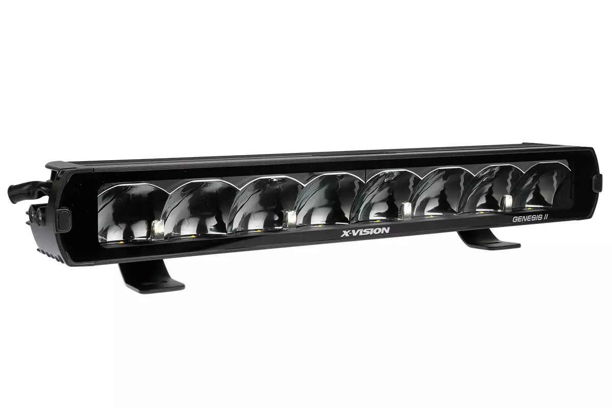 X-Vision Genesis II 600 spot auxiliary light with a narrow spot light pattern is the second-generation updated model of the popular X-Vision Genesis 600 auxiliary light, offering one of the most advanced reflector technologies on the market, providing an excellent point light pattern. The color temperature of the Genesis series lights has been optimized to reduce strain on the eyes, providing a whole new driving experience without compromising on the appearance of the lights. The light has two different power modes: a Double Up power mode (not approved for road use) and a lower light output mode approved for road use. The power mode is selected such that when the light's ground and power are connected, the light operates in Double Up mode. If a separate limiter wire is connected, the light output decreases to the approved level for road use.